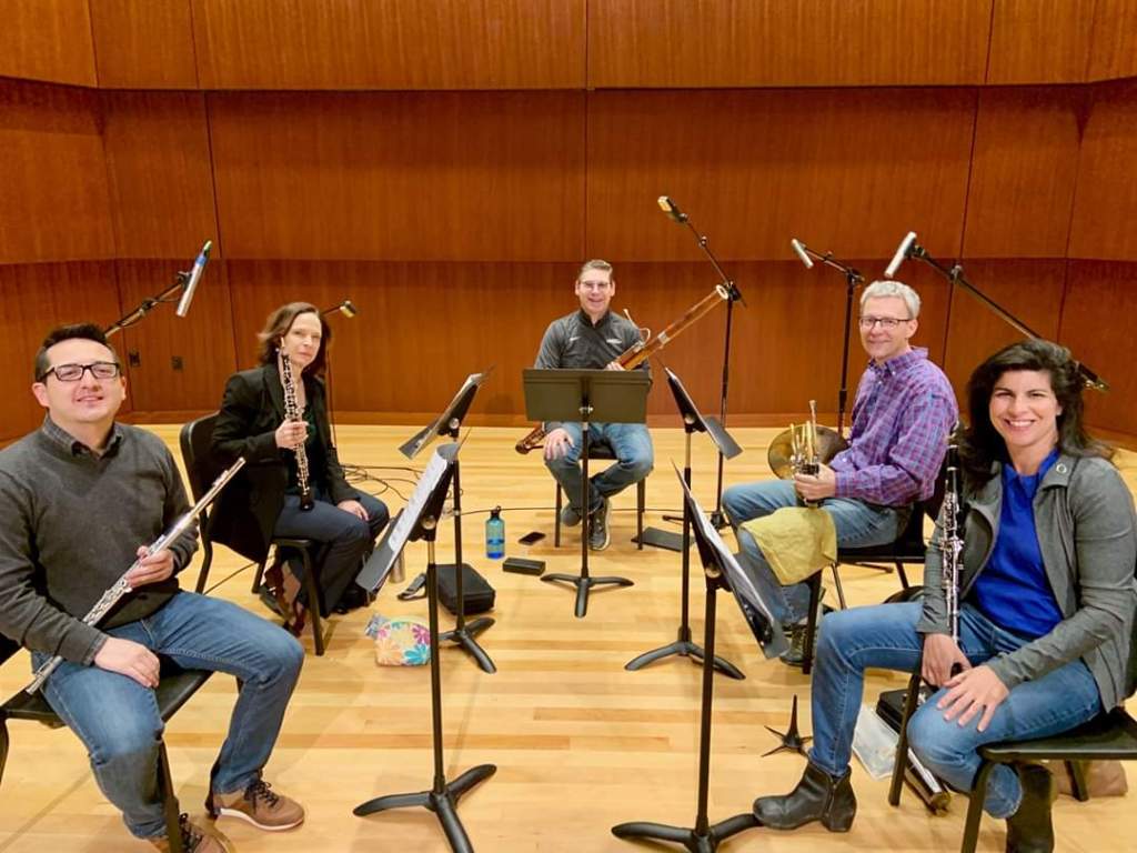 Recording session of Quinteto: Daniel Velaso, flute; Stephanie Zelnick, clarinet; Eric Stomberg, bassoon; Paul Stevens, horn.